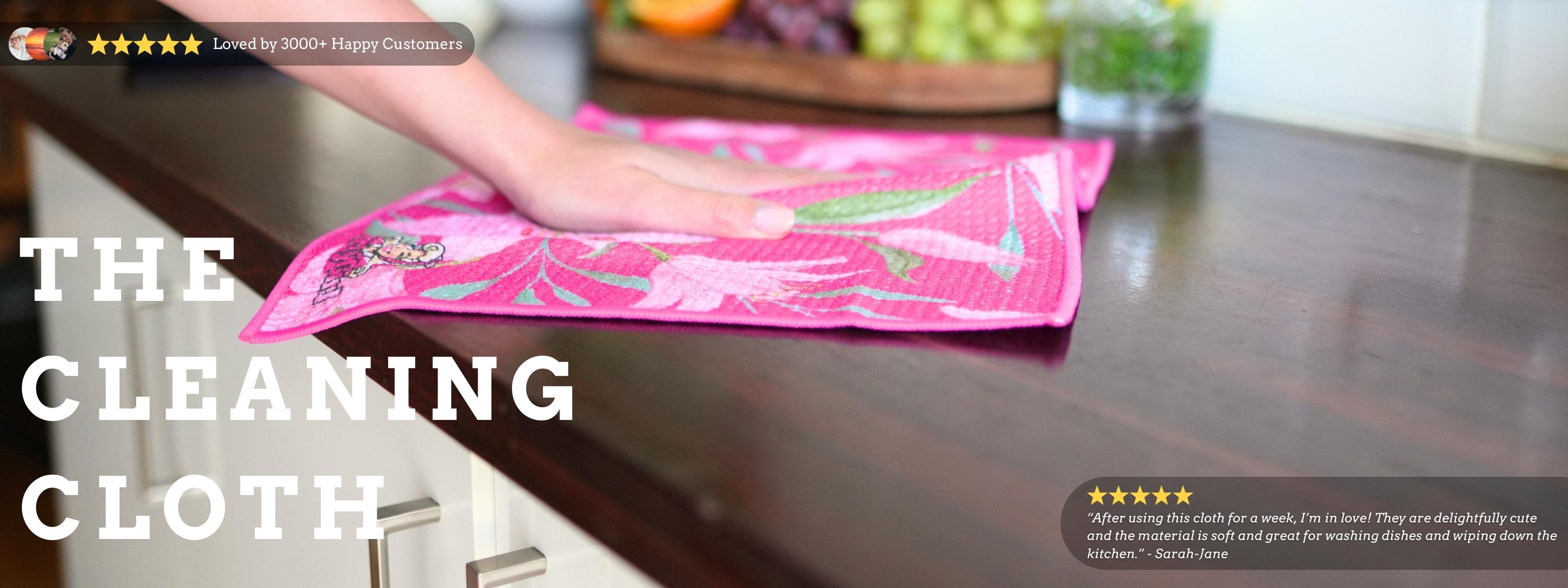 Hand wiping kitchen surface with DirtyGirl Berry Fresh Cloth – Lint-free finishDirtyGirl Berry Fresh Cloth draped over sink tap – Absorbent weave for spills